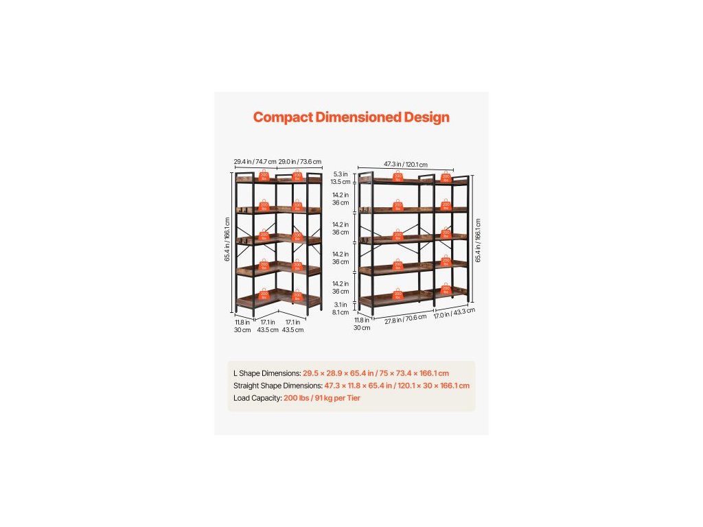 Rozměry rovného tvaru: 47,2 x 11,8 x 65,4 palce / 120,1 x 30 x 166,1 cm,LED světelný pásek: N/A,Nosnost: 200 lbs / 91 kg na úroveň,Rozměry tvaru L: 29,5 x 28,9 x 65,4 palce / 75 x 73,4 x 166,1 cm,Barva: Černý kovový rám + hnědé dřevěné police,Číslo modelu položky: YJX-SNJ-001, Materiál: Kovové trubky + MDF dřevo, Úložné patra: 5 vrstev, Čistá hmotnost: 31,9 kg, Způsob ovládání LED: Není k dispozici