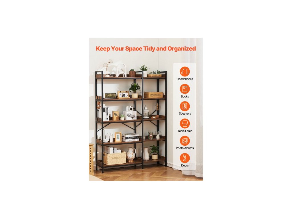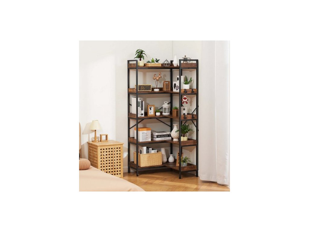 5patrová rohová knihovna, vysoká rohová knihovna se 4 háčky, organizér na knihovnu ve tvaru L s kovovým rámem a dřevěnými policemi, oboustranný stojan na knihy do ložnice, obývacího pokoje, kanceláře