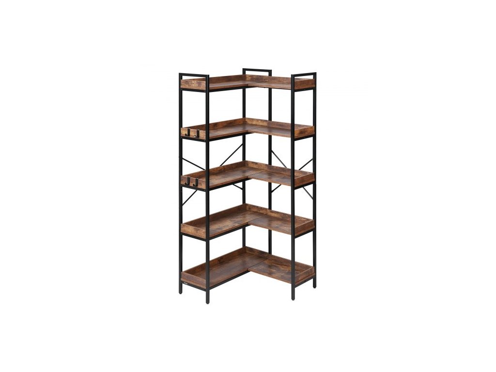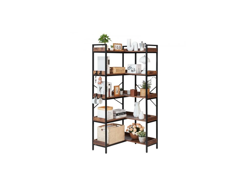 Rohová knihovna s 5 úrovněmi, vysoká rohová knihovna se 4 háčky, organizér na knihovnu ve tvaru L s kovovým rámem a dřevěnými policemi, oboustranný regál na knihy do ložnice, obývacího pokoje, kanceláře