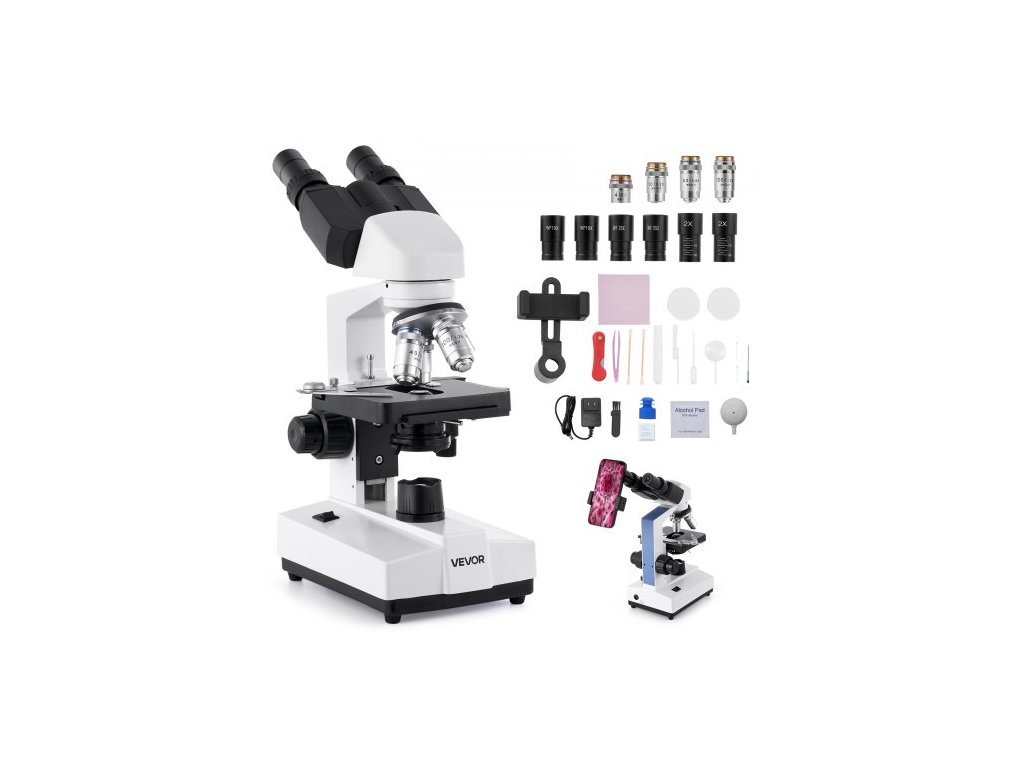 Binokulární mikroskop pro dospělé, profesionální sada složené mikroskopické sady se zvětšením 40–5000x, dvojitým zorným polem a dvěma sadami okulárů, tělo z hliníkové slitiny, včetně LED světla a držáku na telefon.