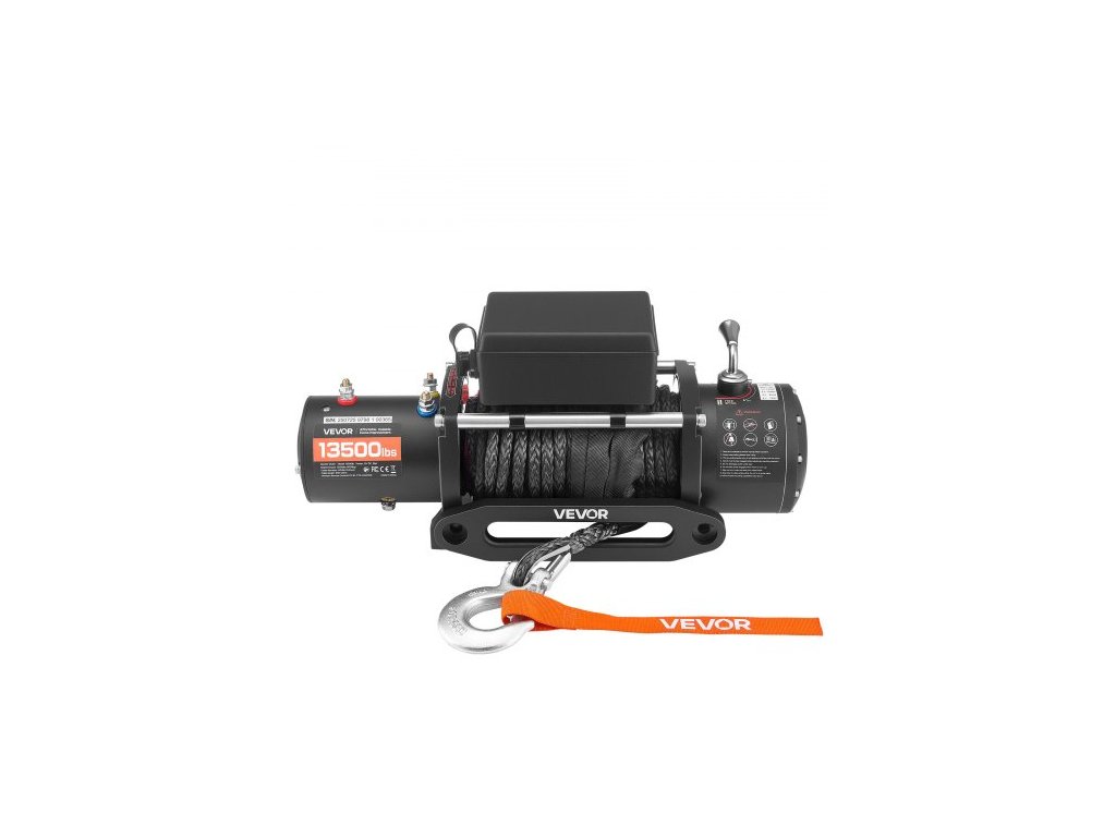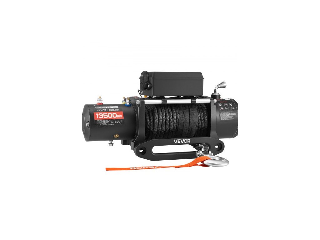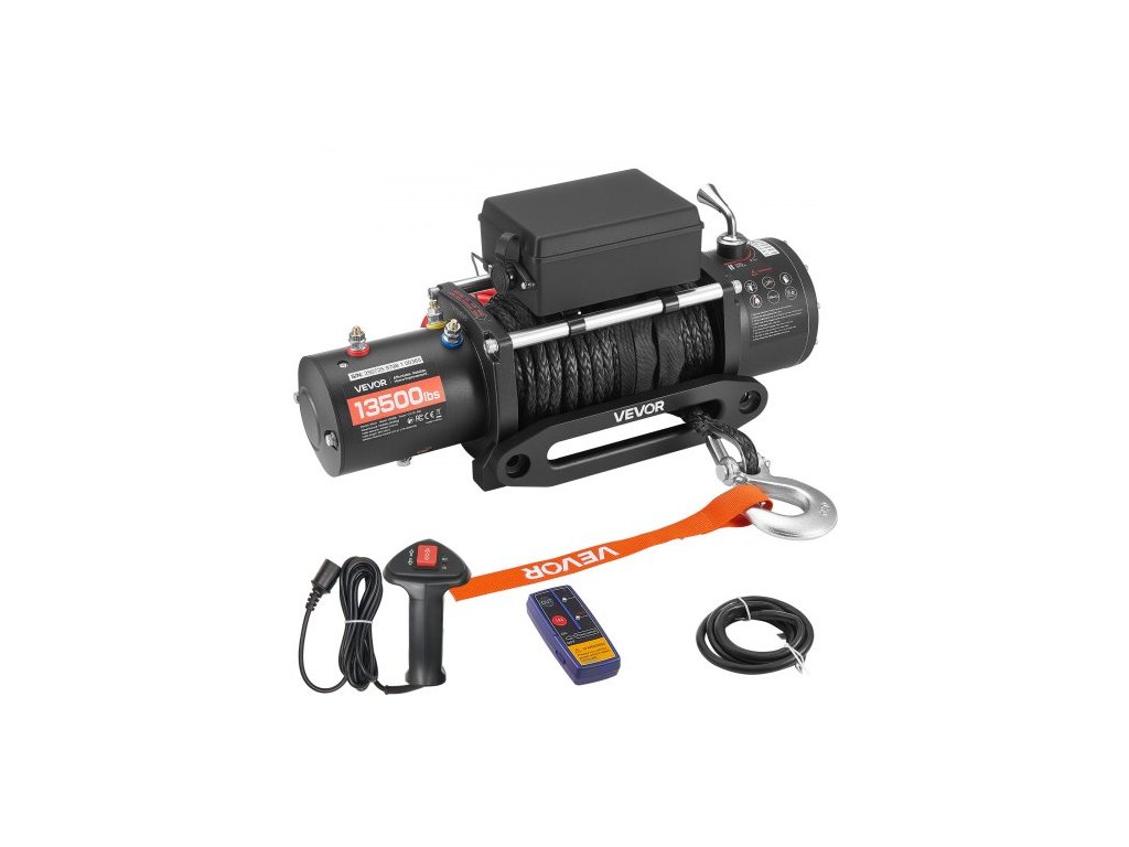 Jmenovitý tah lana: 13500 lbs / 6100 kg, Specifikace lana: Syntetické lano, průměr: ?3/8 palce / 9,5 mm; Délka: 26 m, Hlavní materiály: Hliníková slitina, ocel, plast, Krytí: IP55, Číslo modelu položky: 6500 kg, Specifikace motoru: 12V DC, 6 HP motor z čisté mědi, Převodový poměr: 265:1, Rozměry položky: 534 x 160 x 215 mm (bez ovládací jednotky), Režimy ovládání: Bezdrátové a kabelové dálkové ovládání, Čistá hmotnost: 23 kg