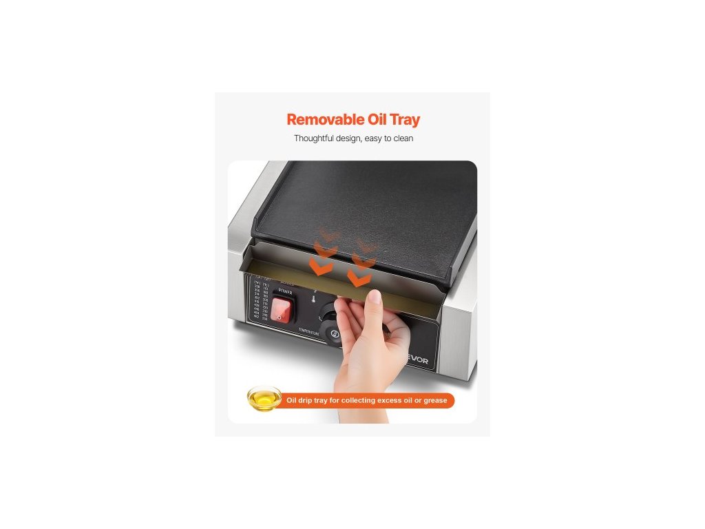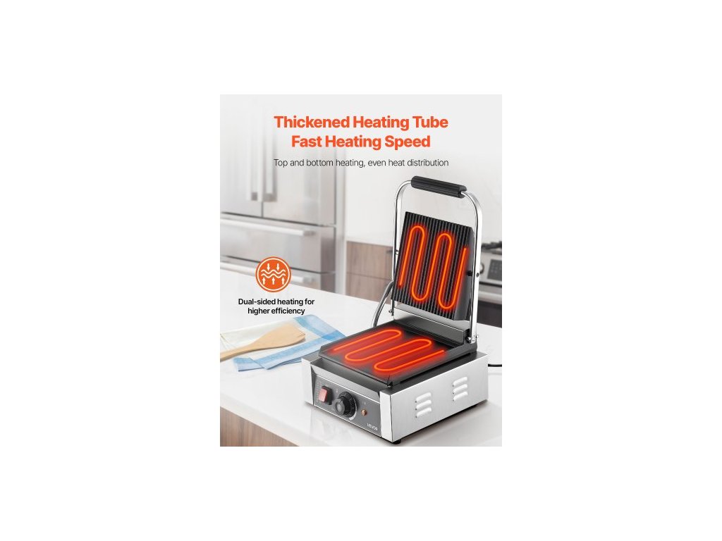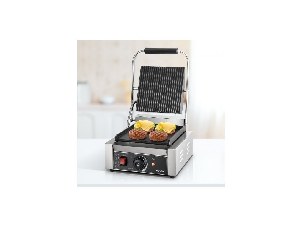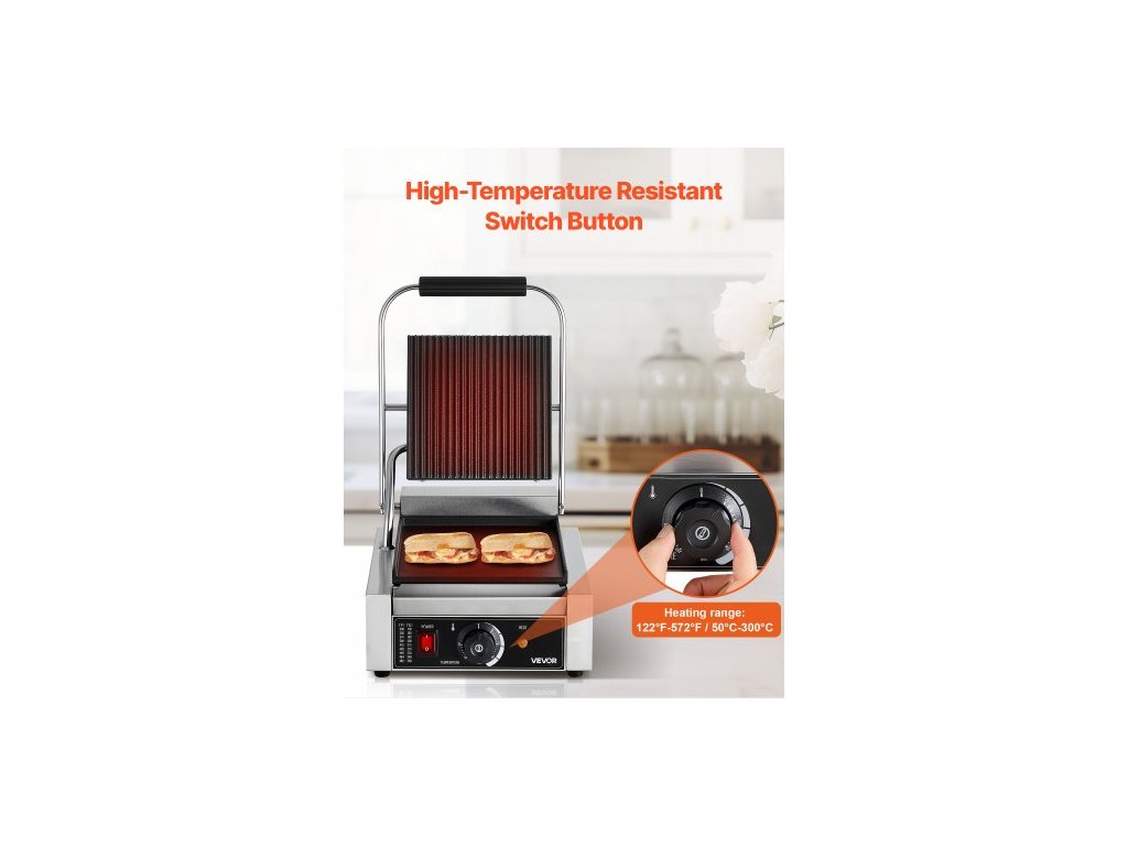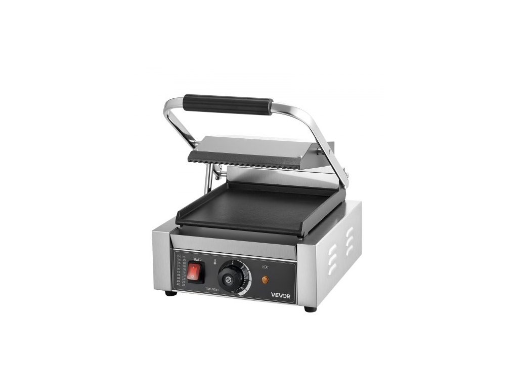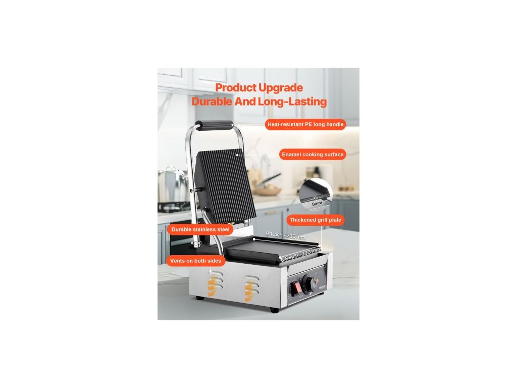 Komerční panini gril, elektrický sendvičovač panini s výkonem 1800 W, nerezový sendvičový lis s rukojetí a regulací teploty, plochý smaltovaný talíř 22x23 cm, na hamburger, steak se slaninou
