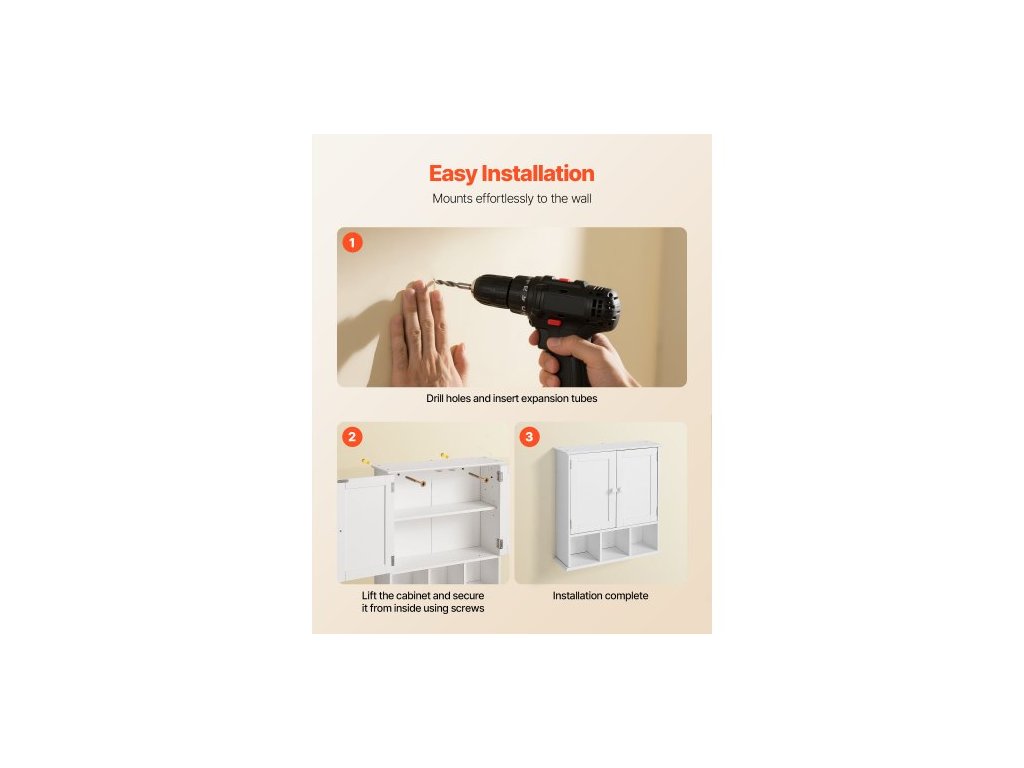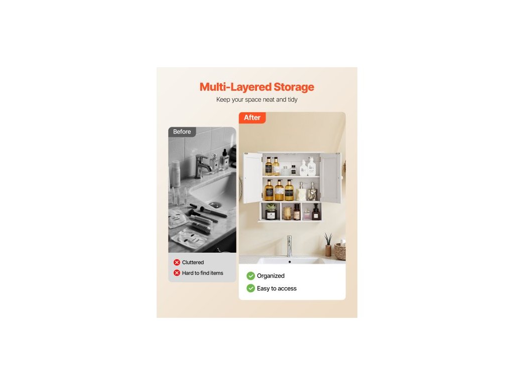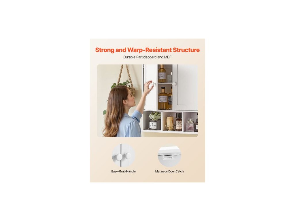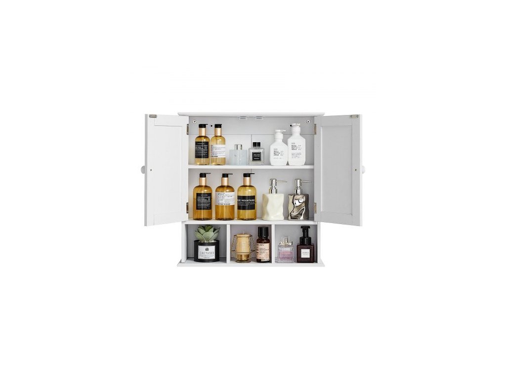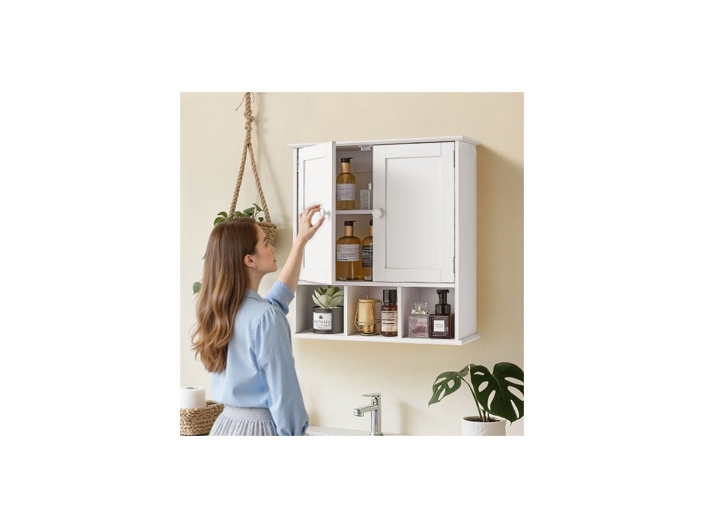 Nástěnná skříňka do koupelny, 2 dveře a nastavitelná police, nad toaletu, úložná skříňka na lékárničky, nástěnná, závěsný organizér s policemi a otevřenou přepážkou do prádelny, kuchyně, toalety, bílá