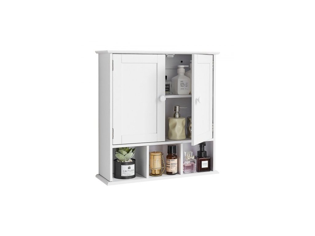 Nástěnná skříňka do koupelny, 2 dveře a nastavitelná police, úložná skříňka na lékárničku nad toaletu, nástěnná závěsná skrýška s policemi a otevřenou přepážkou do prádelny, kuchyně, toalety, bílá