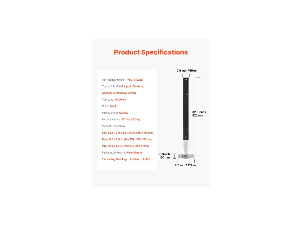 Maximální zatížení: 6000 lbs/2722 kg,Rozměry nohy: 32,5 x 2,6 x 6,3 palce/825 x 65 x 160 mm,Rozměry čepu: 7,9 x 3,1 x 2,8 palce/200 x 80 x 70 mm,Barva: Černá,Číslo modelu položky: 179013 (olovo),Hmotnost výrobku: 27,1 lbs/12,3 kg,Kompatibilní model: Lippert Venture, Atwood, Stromberg Carlson, Rozměry základny: 8,5 x 6,3 x 1,4 palce/215 x 160 x 35 mm, Hlavní materiál: Q235A