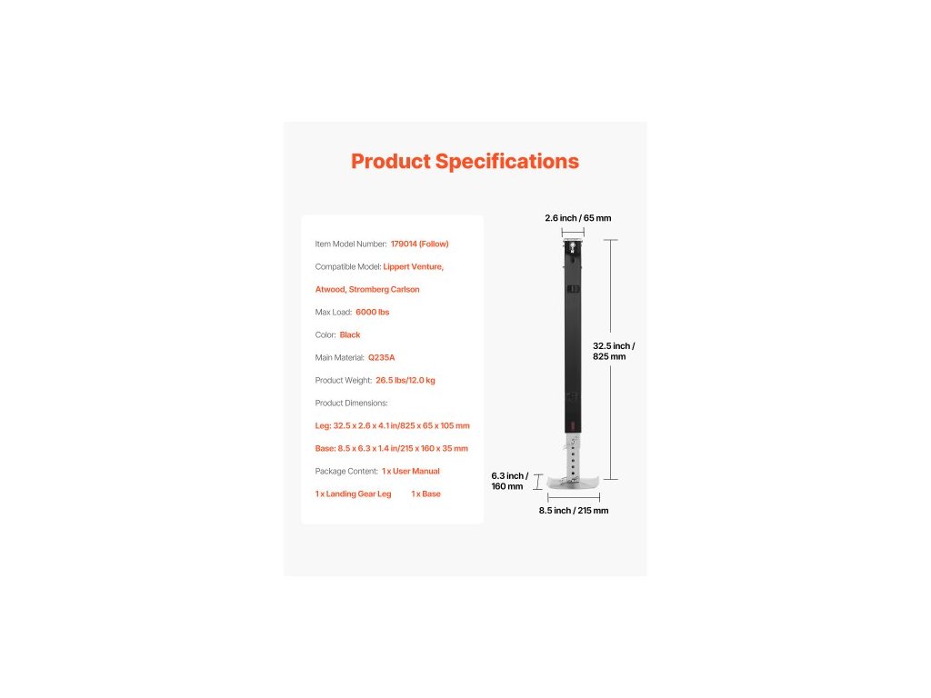Maximální zatížení: 6000 lbs/2722 kg,Rozměry nohy: 32,5 x 2,6 x 4,1 palce/825 x 65 x 105 mm,Barva: Černá,Číslo modelu položky: 179014 (Follow),Hmotnost výrobku: 26,5 lbs/12,0 kg,Kompatibilní model: Lippert Venture, Atwood, Stromberg Carlson,Rozměry základny: 8,5 x 6,3 x 1,4 215 x 160 x 35 mm, hlavní materiál: Q235A