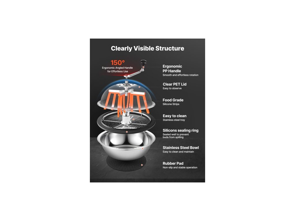 Materiál misky: nehrdzavejúca oceľ 201, počet nožov: 4 × 3, materiál veka: PET, číslo modelu: V-BT-PS-13, rozmery: 330 × 330 × 370 mm, hmotnosť: 2,6 kg, rukoväť: hliníková rukoväť s uhlom 145
