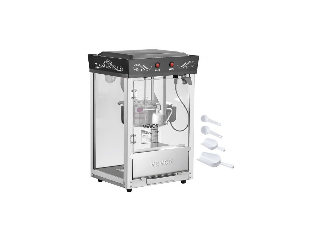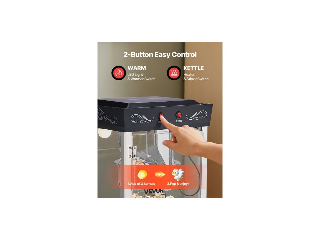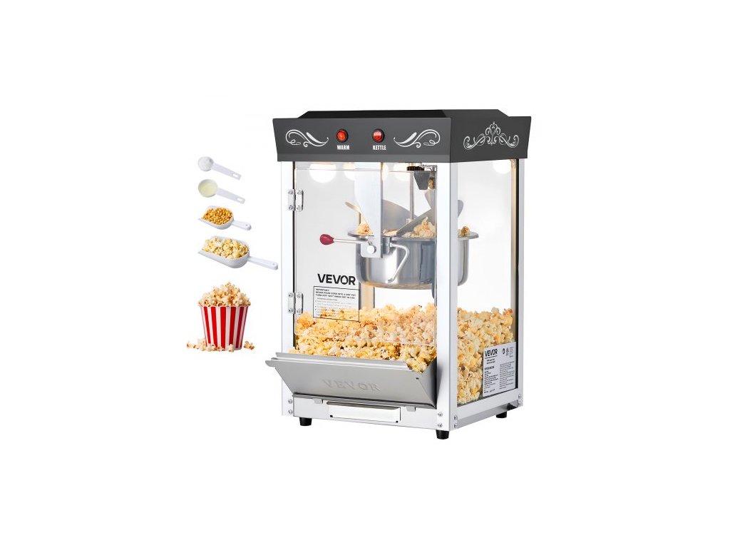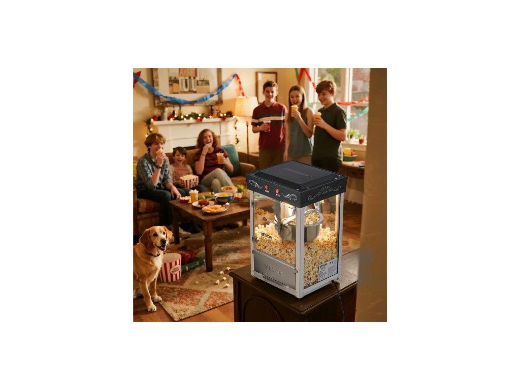 Popcorn stroj, konvice z nerezové oceli s kapacitou 0,2 kg, 800W profesionální stolní popcorn stroj, 48 šálků na dávku, popcorn v divadelním stylu, s ovládáním 2 tlačítky, skleněná stěna, PC dvířka, 1 odměrka, 3 lžičky, černá