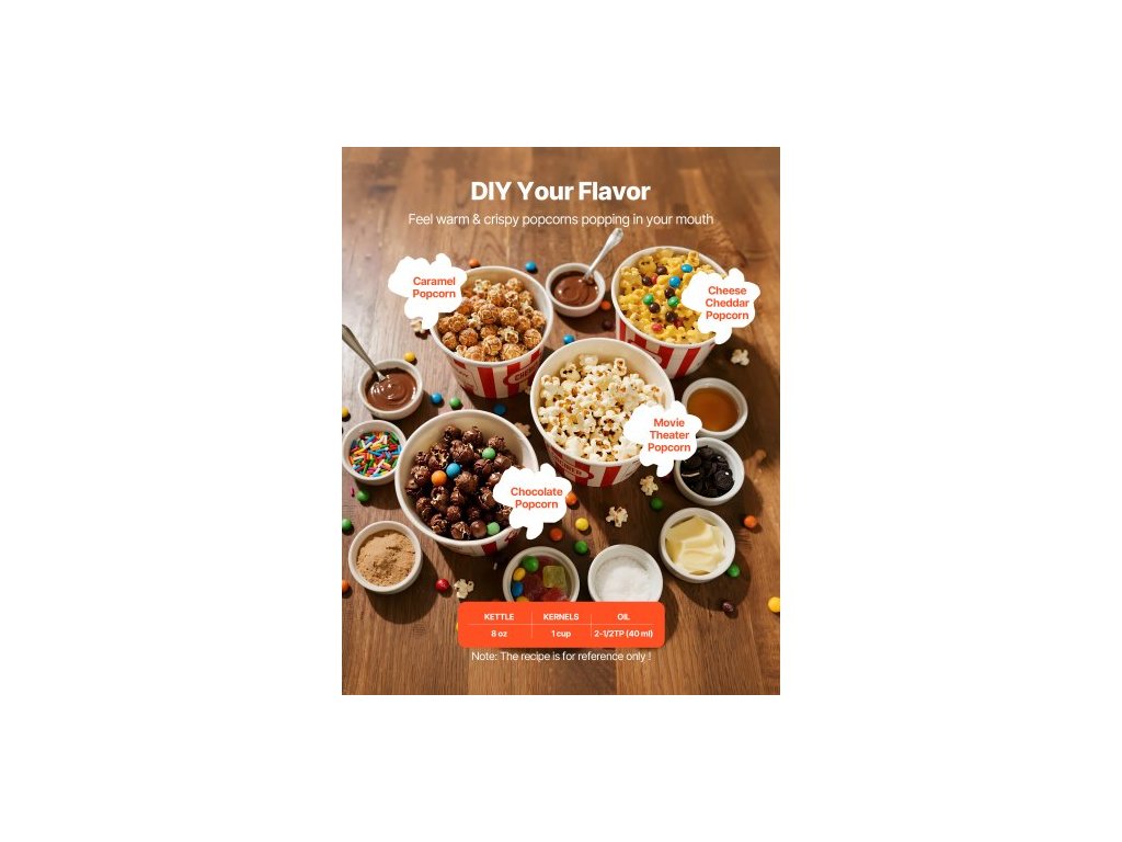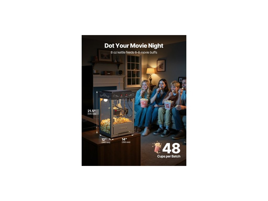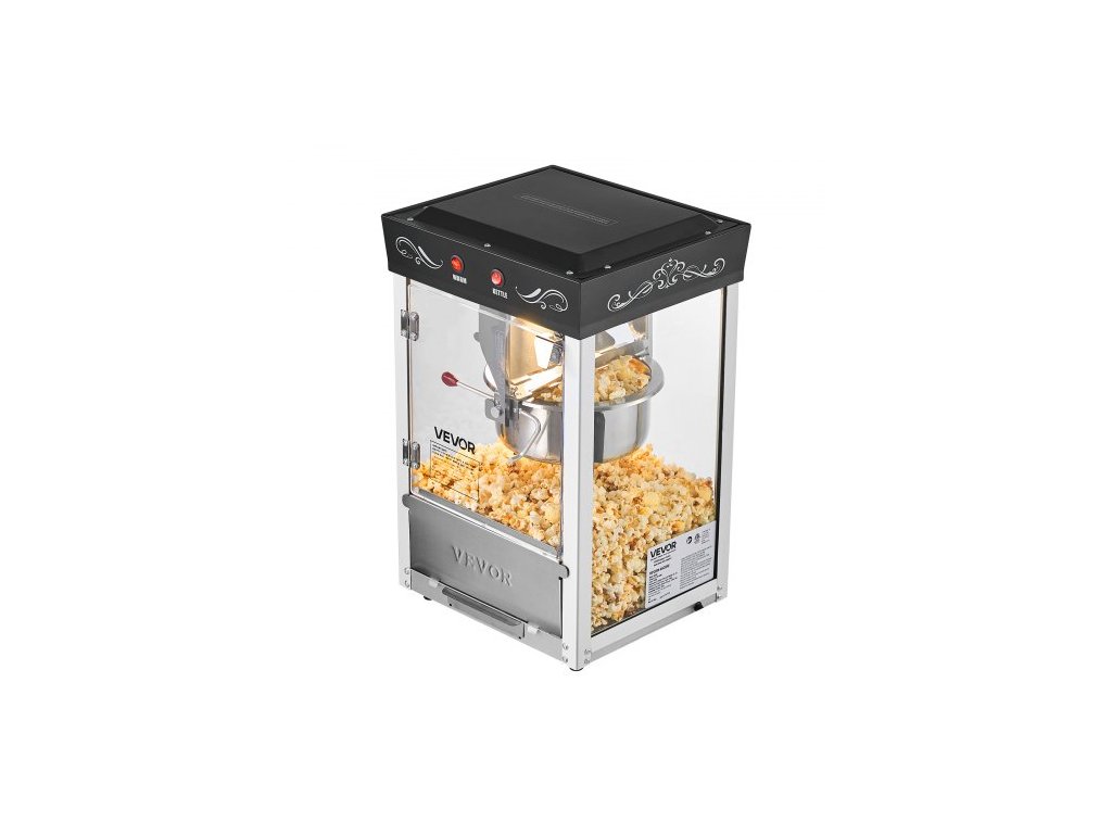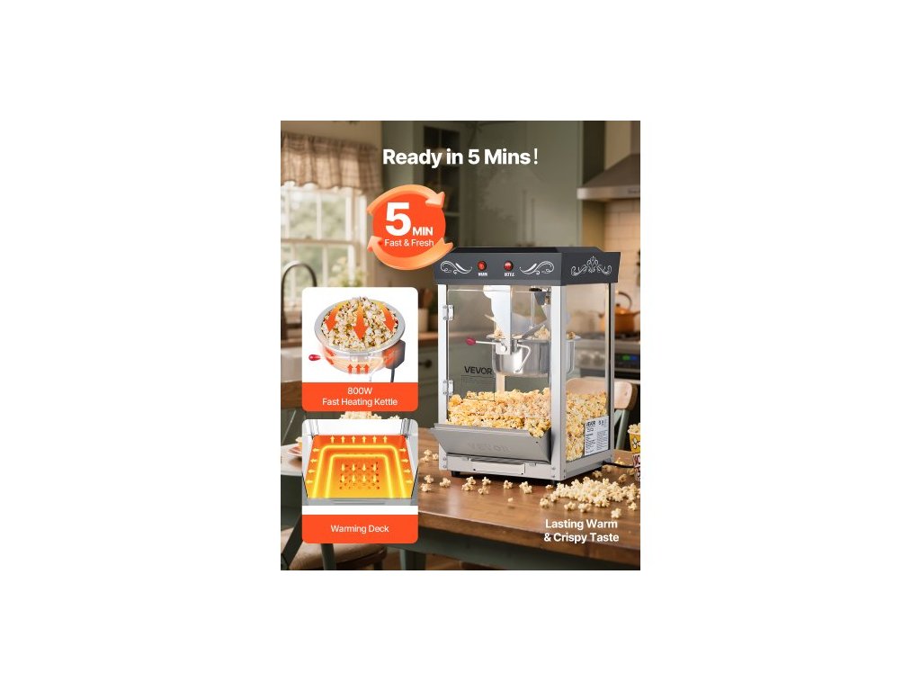 Popcorn stroj, konvice z nerezové oceli s kapacitou 0,2 kg, 800W profesionální stolní popcorn stroj, 48 šálků na dávku, popcorn v divadelním stylu, s ovládáním 2 tlačítky, skleněná stěna, PC dvířka, 1 odměrka, 3 lžičky, černá