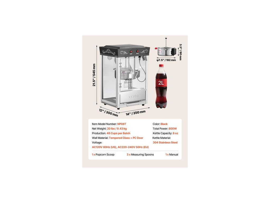 Materiál konvice: nerezová ocel 304, materiál stěny: tvrzené sklo + PC dvířka, barva: černá, napětí: AC120V 60Hz (US), AC220-240V 50Hz (EU), celkový výkon: 800W, produkce: 48 šálků na dávku, číslo modelu položky: NP08T, čistá hmotnost: 9,43 kg, objem konvice: 237 ml