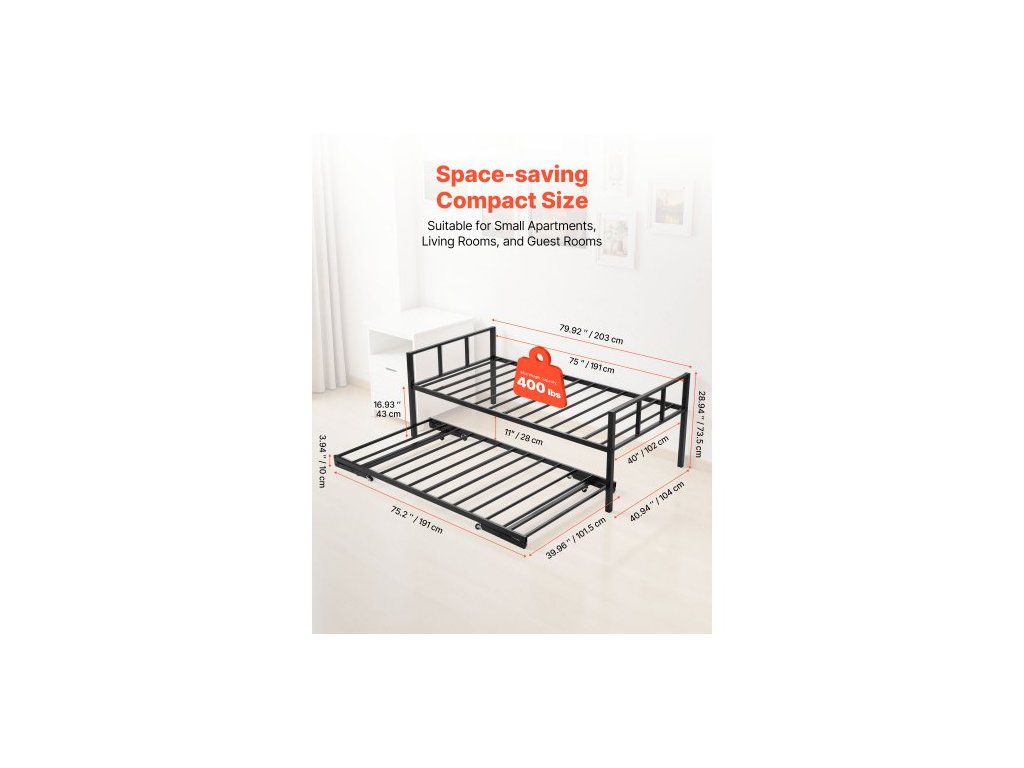 Typ: Zvedací,Výška od podlahy k dolní části postele: 43 cm,Nosnost: 181,44 kg,Barva: Černá,Číslo modelu položky: YJX-BF-004,Materiál: Q195,Výška od podlahy k výsuvné postelí: 10 cm,Čistá hmotnost: 24 kg,Denní postel: 203 x 102 x 74 cm 104 x 73,5 cm, Rozkládací postel: 75,2 x 39,96 palce / 191 x 101,5 cm