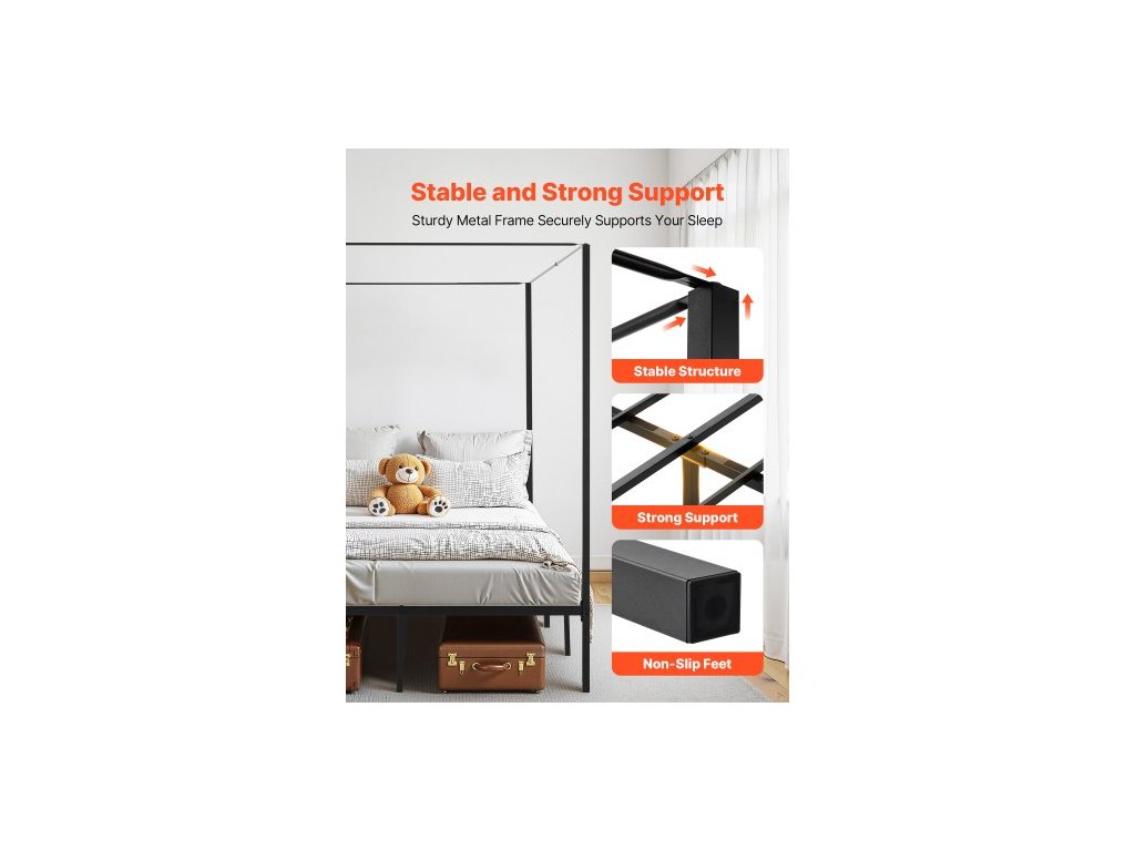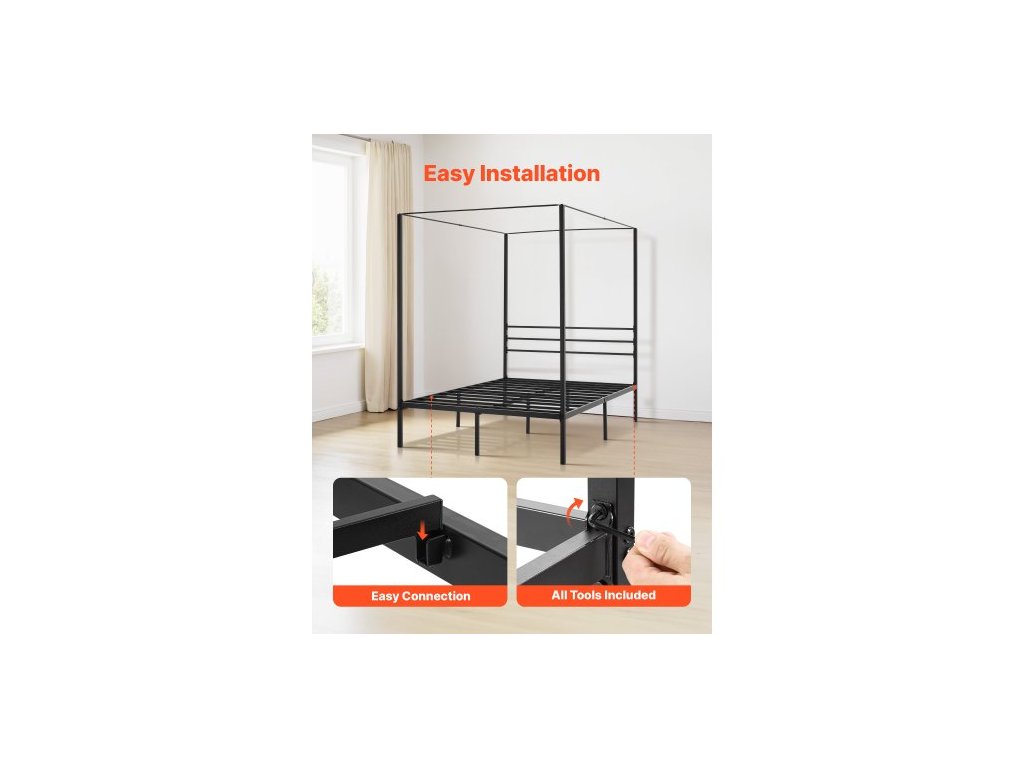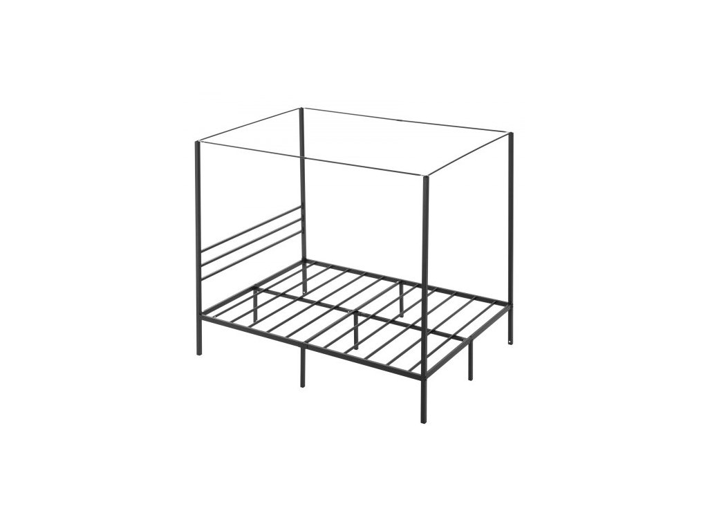 Rám postele s nebesy Full Size, kovová postel s nebesy a designem čtyř nebes, odolné ocelové lamely, úložný prostor pod postelí, bez nutnosti pružinového roštu, snadná montáž, černá