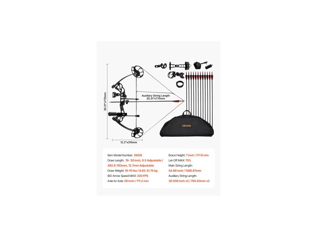 Vzdálenost mezi osami: 28 palců / 711,2 mm, délka hlavní tětivy: 54,68 palce / 1388,87 mm, délka pomocné tětivy: 31 palců / 785,83 mm, číslo modelu: EM28, hmotnost výrobku: 7,28 liber / 3,3 kg, maximální rychlost šípu IBO: 320 fps, délka nátahu: 19-30 palců / 482,6-762 mm, MAXIMÁLNÍ uvolnění: 75 %, Výška vzpěry: 7 palců / 177,8 mm, Síla nátahu: 19-70 liber / 8,62-31,75 kg, Rozměry výrobku: 30,31x12,2x2,36 palce / 770x310x60 mm