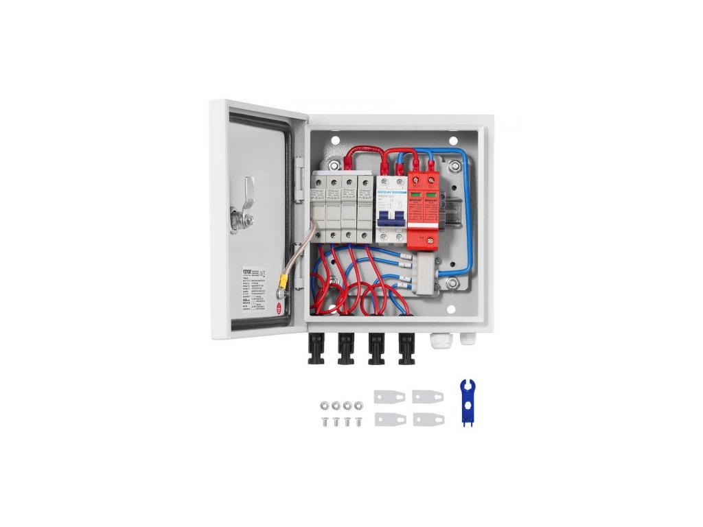 Stupeň krytia: IP65,Čistá hmotnosť (vrátane všetkého príslušenstva): 7,1 lbs / 3,22 kg,Spôsob otvárania dverí: otváranie s otočným zámkom,Menovité prevádzkové napätie: DC 500V,Prepäťová ochrana: 40KA 2P DC500V,Špecifikácia hlavného ističa: 63A 2P DC500V,Špecifikácia držiaka poistiek: DC 15A výstupy/500VN : 1,Tesniaca páska: PU materiál z polyuretánovej peny (čierna),Montážna doska: Odnímateľná montážna doska (materiál: oceľ valcovaná za studena s práškovou povrchovou úpravou),Počet vstupov: 4,Číslo modelu: SP-HL-S252310-15A, Menovitý prúd poistky: DC 15A, Celkové vonkajšie rozmery výrobku (D x Š x V): 9,06 x 9,84 x 3,94 palca / 230 x 250 x 100 mm, Hlavný materiál: 0,8 mm za studena valcovaná oceľ + sivobiely náter RAL7035