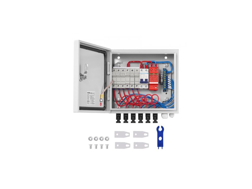 Stupeň krytia: IP65,Čistá hmotnosť (vrátane všetkého príslušenstva): 8,55 lbs / 3,88 kg,Spôsob otvárania dverí: otváranie s otočným zámkom,Menovité prevádzkové napätie: DC 500V,Prepäťová ochrana: 40KA 2P DC500V,Špecifikácia hlavného ističa: dC 15A/500V DC 15A : 1,Tesniaci pás: PU materiál z polyuretánovej peny (čierny),Montážna doska: Odnímateľná montážna doska (Materiál: oceľ valcovaná za studena s práškovým náterom),Počet vstupov: 6,Číslo modelu: SP-HL-S252810-15A, Prúdová hodnota poistky: DC 15A,Celkové vonkajšie rozmery výrobku (D x Š x V): 11,02 x 9,84 x 3,94 palca / 280 x 250 x 100 mm, Hlavný materiál: 0,8 mm za studena valcovaná oceľ + sivobiely náter RAL7035