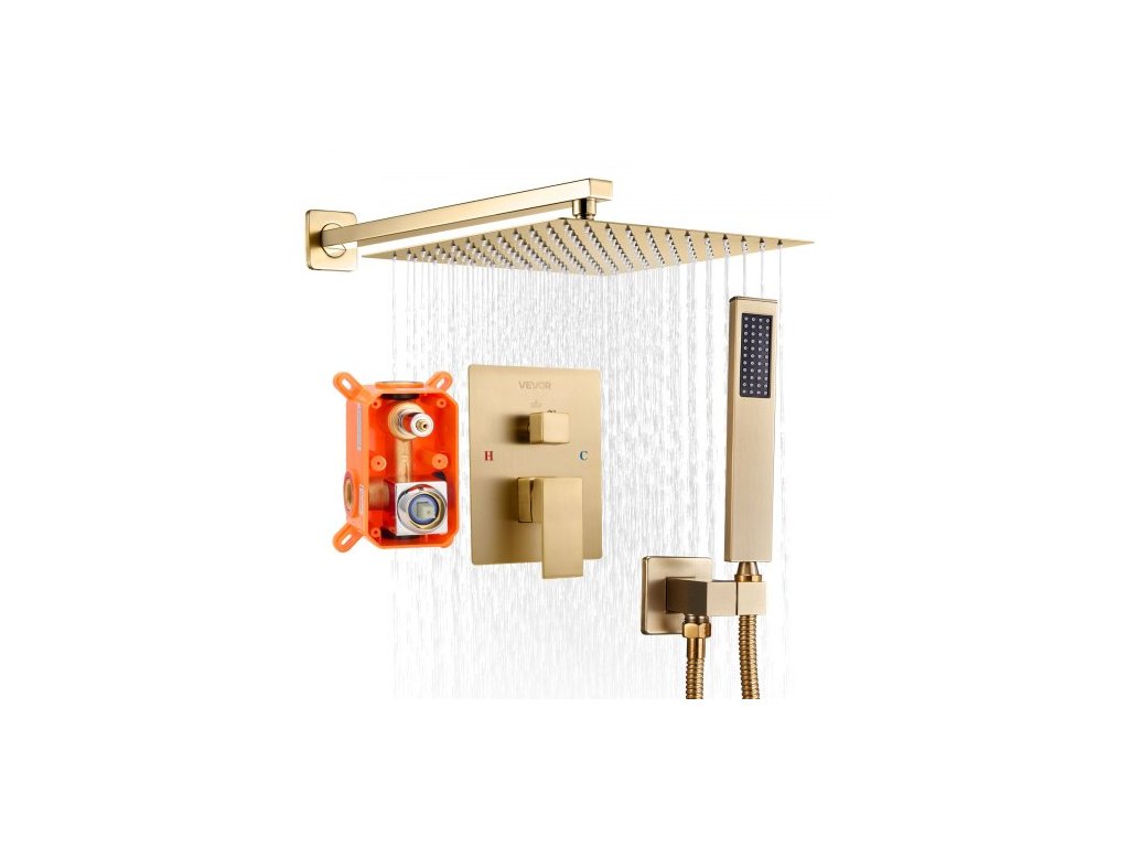Sprchová baterie , sprchový systém Rainfall do koupelny s čtvercovou sprchovou hlavicí Rain o průměru 25,4 cm a ruční sprchou, nástěnné vanové armatury s mosazným ventilem a ozdobnou sadou, kartáčované zlato