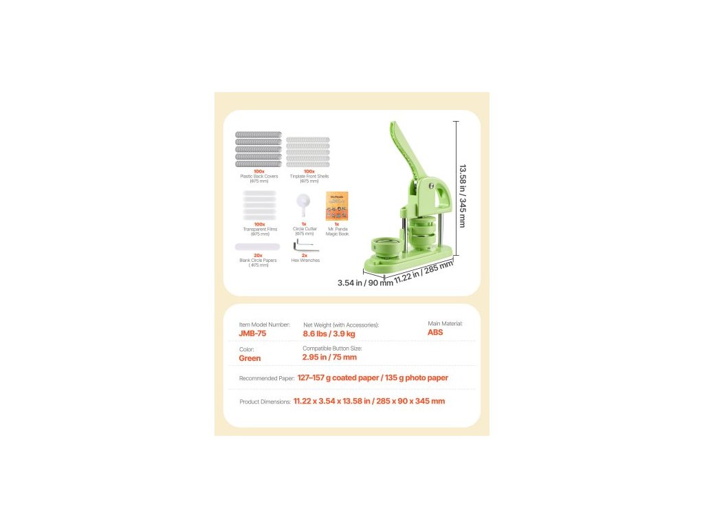 Kompatibilní velikost knoflíků: 75 mm,Doporučený papír: 127–157 g potahovaný papír / 135 g fotografický papír,Barva: Zelená,Číslo modelu položky: JMB-75,Čistá hmotnost (s příslušenstvím): 3,9 kg,Rozměry výrobku: 285 x 90 x 345 mm,Hlavní materiál: ABS