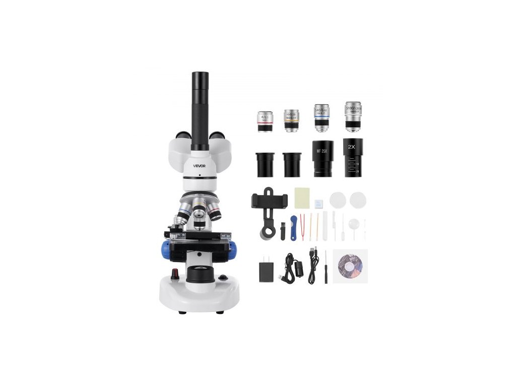 Trinokulární mikroskop pro dospělé, profesionální sada složené mikroskopie se zvětšením 40–5000X, tělo z hliníkové slitiny, obsahuje LED světlo a držák na telefon, pro laboratoř, školu, domácnost a vzdělávání