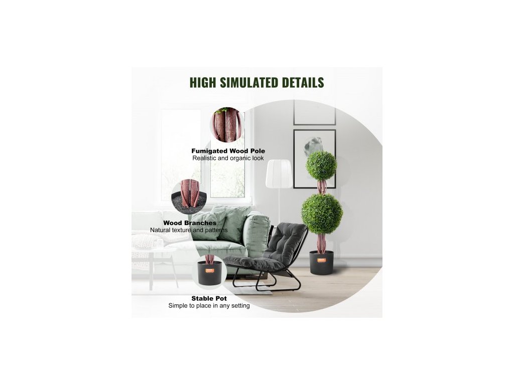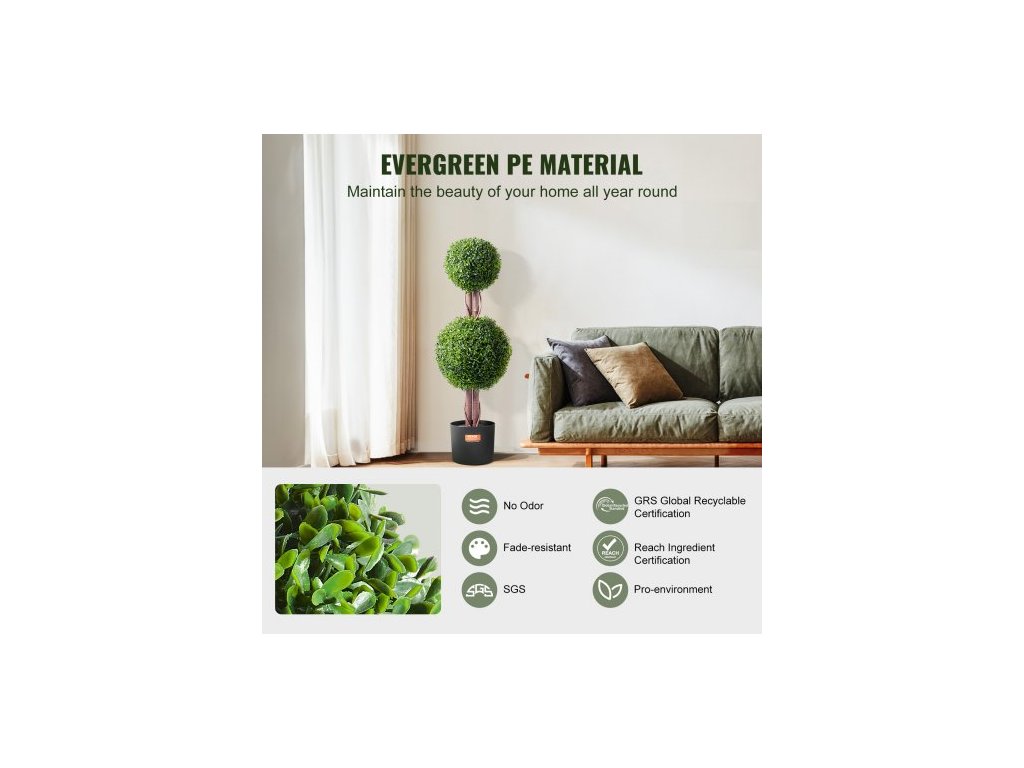 Umelý zimostráz, výška 91,6 cm (2 kusy), umelý topiar s dvojitou guľou, umelá rastlina s extra listami, kvetináčom a malou dekoráciou, sada s UV ochranou na dekoráciu do interiéru/ exteriéru