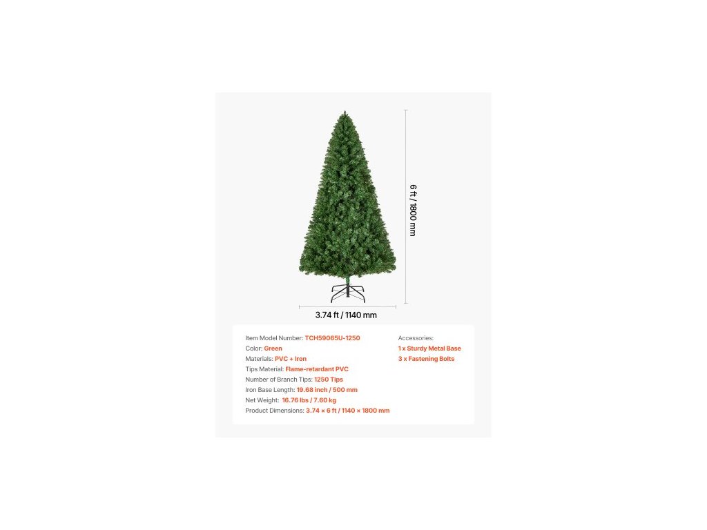 Počet větví: 1250,Barva: Zelená,Materiály: PVC + železo,Číslo modelu položky: TCH59065U-1250,Rozměry výrobku: 3,74 x 6 stop / 1140 x 1800 mm,Materiál větví: PVC zpomalující hoření,Čistá hmotnost: 16,76 lbs / 7,60 kg,Délka železné základny: 19,68 palce / 500 mm