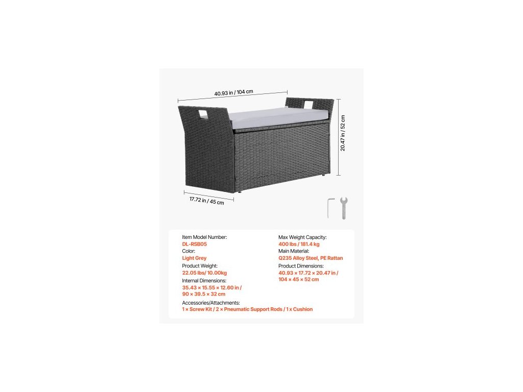 Maximálna nosnosť: 181,4 kg, Farba: sivá, Číslo modelu položky: DL-RSB05, Hmotnosť výrobku: 10,00 kg, Rozmery výrobku: 104 × 45 × 52 cm, Vnútorné rozmery: 40 × 89 × 33 cm cm, Hlavný materiál: legovaná oceľ Q235, PE ratan
