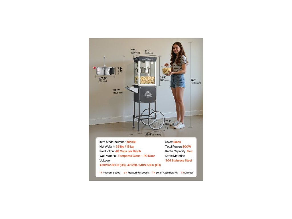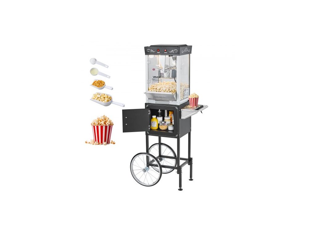 Popcorn stroj s vozíkem, konvice z nerezové oceli o objemu 0,2 kg, komerční výrobník popcornu o výkonu 800 W, 48 šálků na dávku, kino styl, ovládání 2 tlačítky, skleněné stěny, PC dvířka, 1 odměrka, 3 lžíce, černá