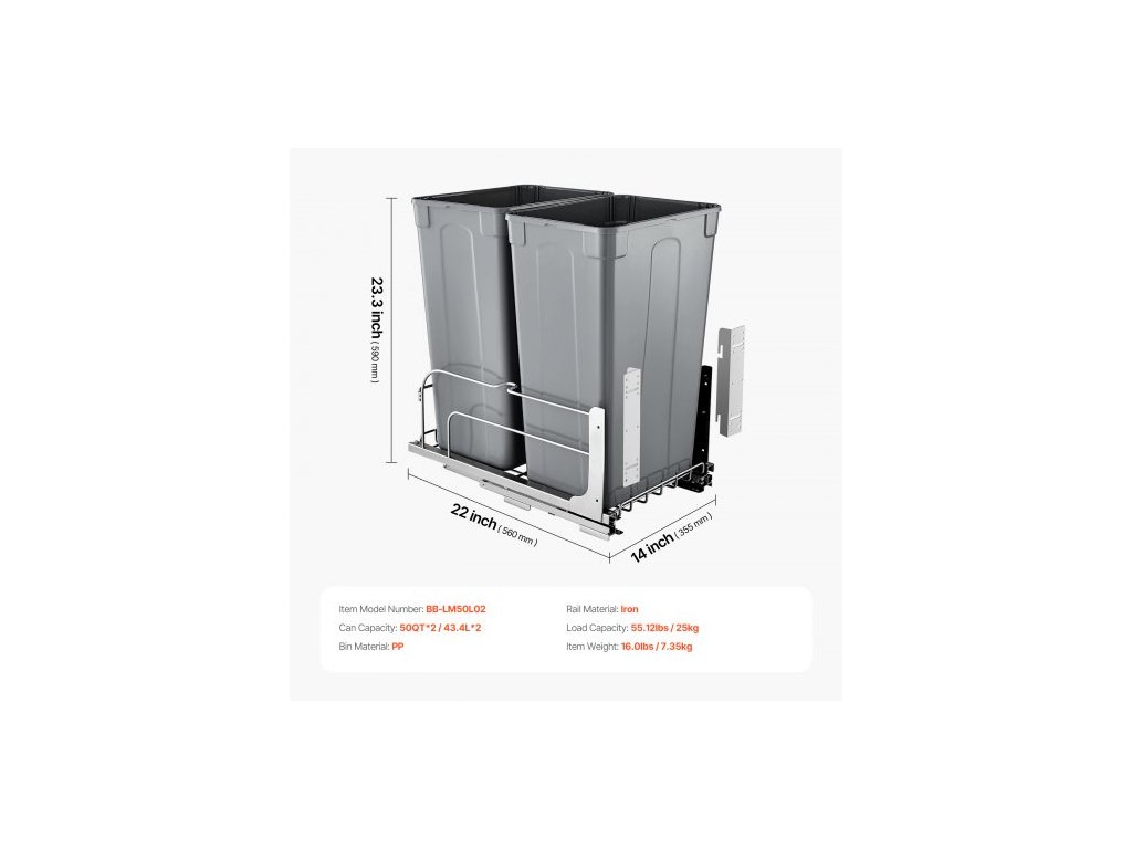 Materiál koše: PP,Nosnost: 66 lbs / 30 kg,Rozměry položky: 22x14x23 palců / 560x355x590 mm,Číslo modelu položky: BB-LM50L02,Materiál kolejnice: Železo,Objem nádoby: 50 qt x 2,Hmotnost položky: 16 lbs / 7,35 kg